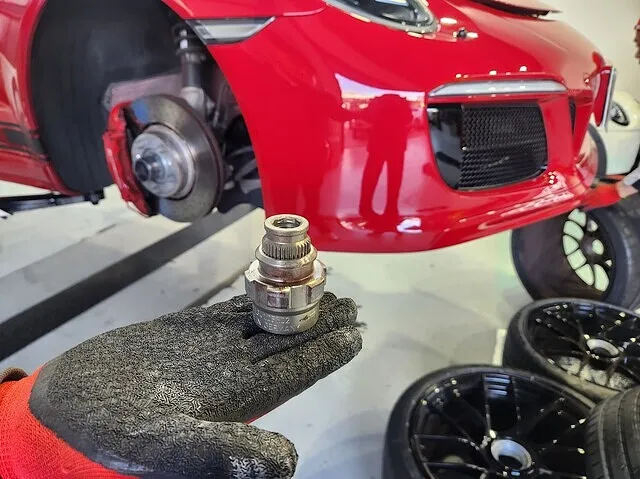 安全面と確実・慎重にするため、センターロックのお車は2~3人で丁寧な作業をして